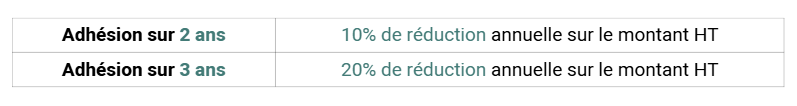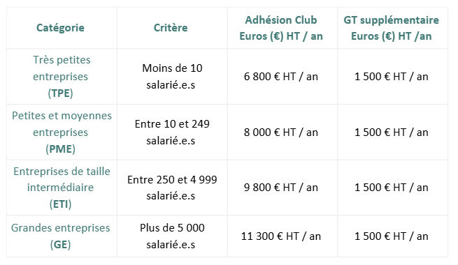Au titre de son engagement, chaque Membre est individuellement tenu au paiement d’une contribution forfaitaire annuelle fixée dans la grille tarifaire ci-dessous (montants en Euros HT ; le taux de TVA applicable est celui en vigueur au moment de la facturation de la prestation).